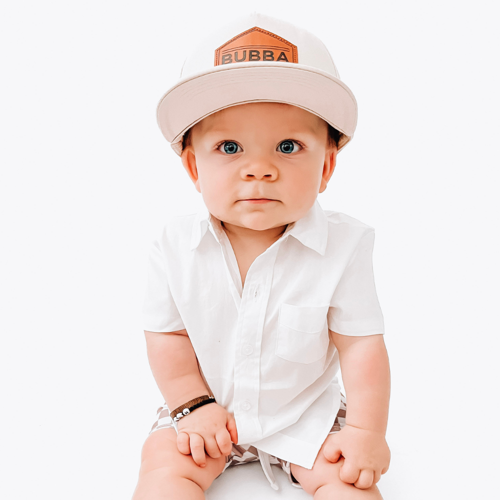 Featured above we have the the classic Kids White Fedora and the Bubba Tan Kids Trucker Hat.