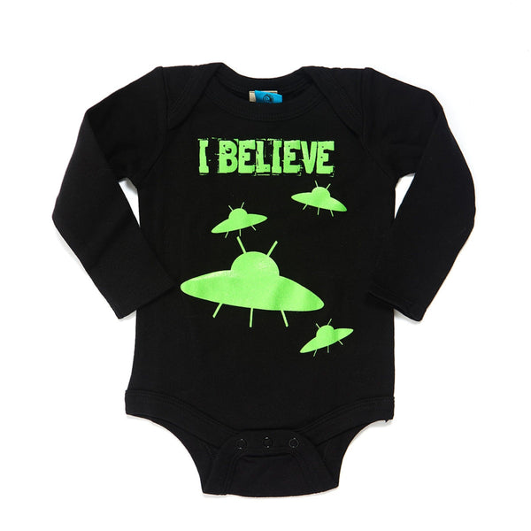 Baby I Believe Onesie for Boys, Knuckleheads UFO Halloween Jumpsuit Costume Baby Outfit