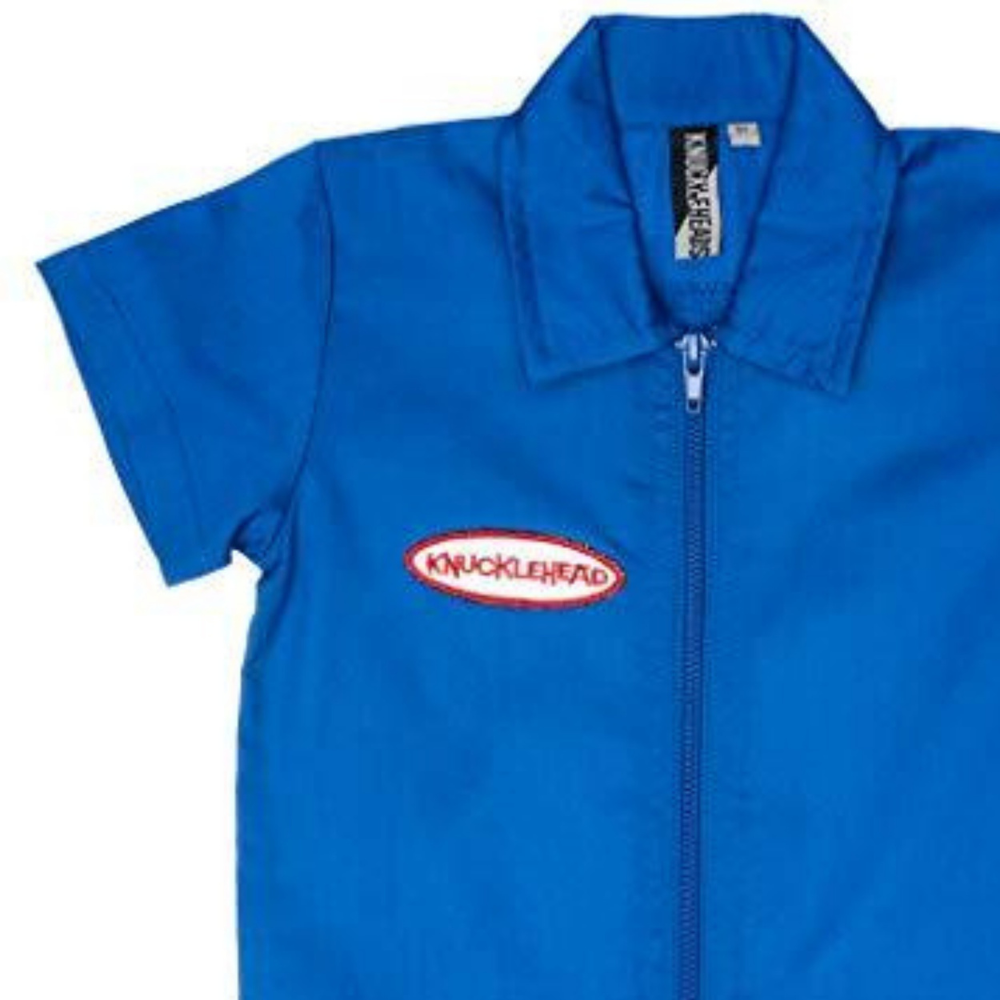 Let's get ready for some serious fun with these stylish Knuckleheads Grease Monkey Coveralls. Crafted from durable blue cotton twill, these coveralls feature a convenient zip front and proudly display the Knuckleheads logo on the chest. Wear them with a relaxed fit for a cool and effortless look.