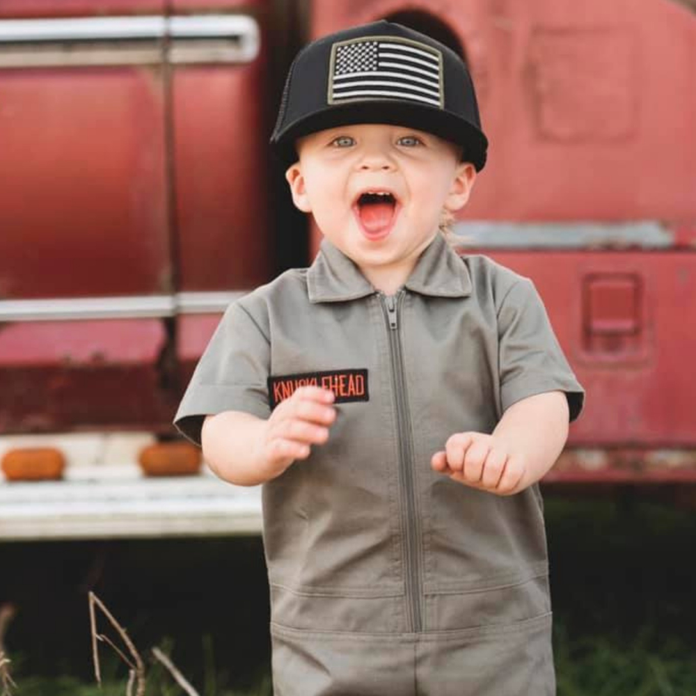 Knuckleheads Kids Dark Olive Coverall for Boys, Mechanic Halloween Jumpsuit Costume Baby Outfit - Knuckleheads Clothing