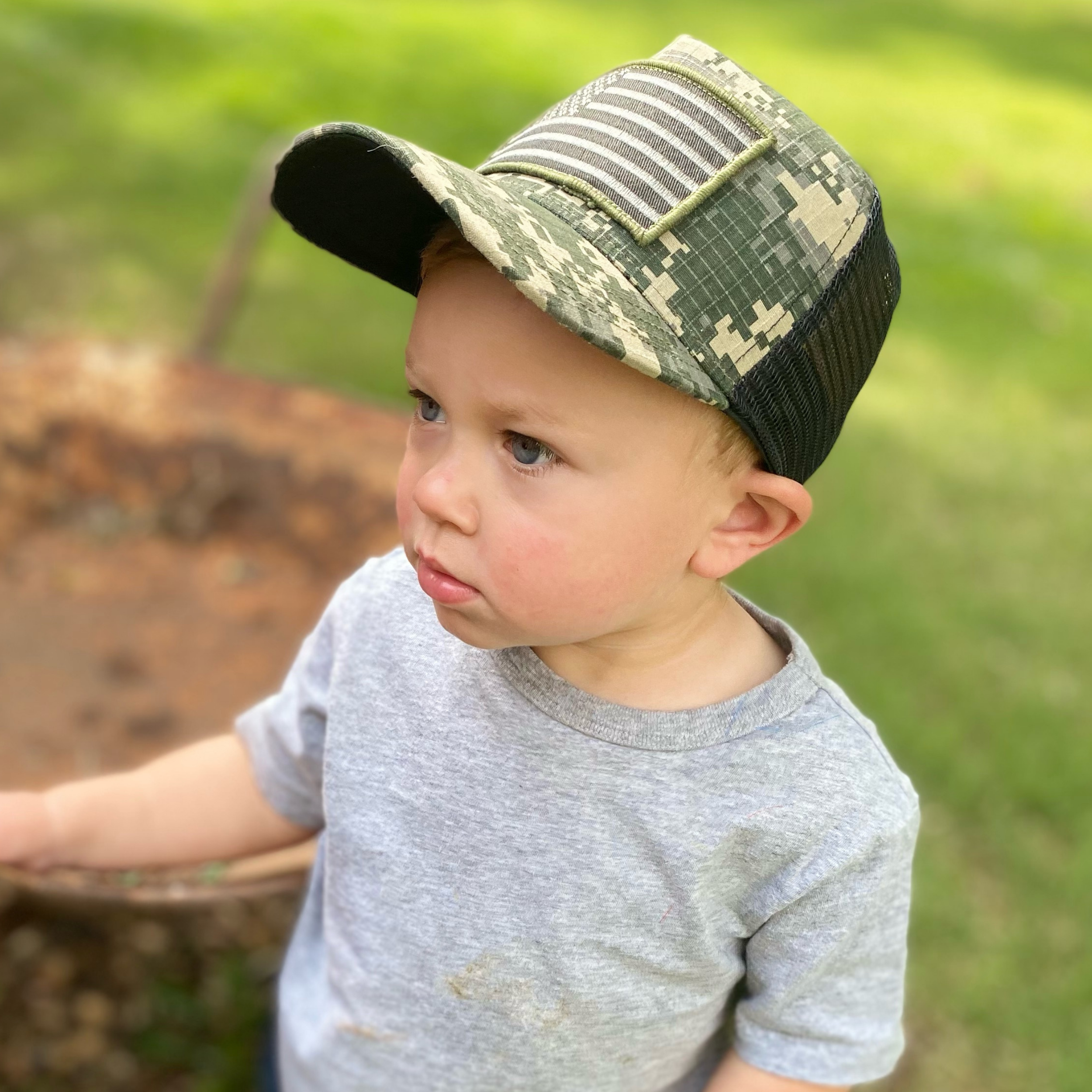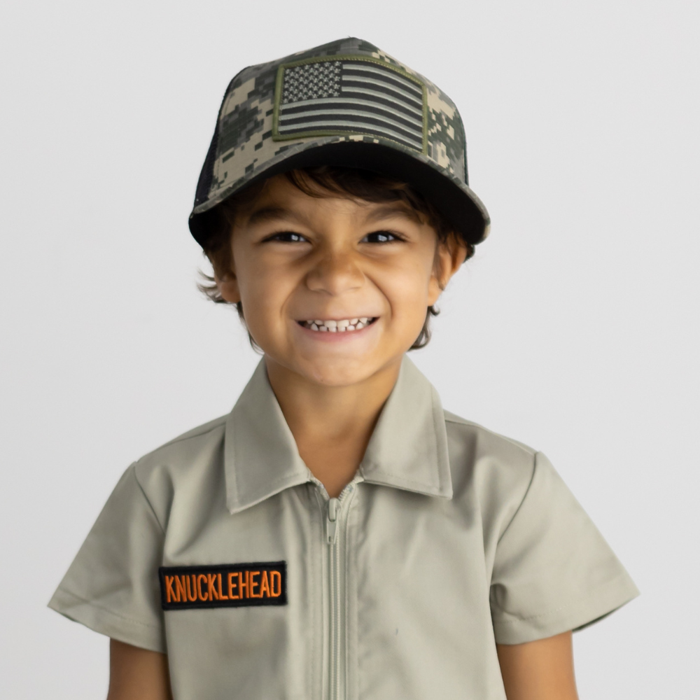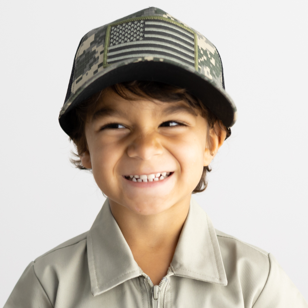 The USA Cool Camo Trucker Hat keeps your kids shielded from the sun's harmful UV rays in style. Featuring a breathable blue mesh back, a flat brim, and an American Flag patch all crafted from high-quality materials, this hat looks great while being durable enough for outdoor play and adventures. Keep your young ones safe and looking sharp!